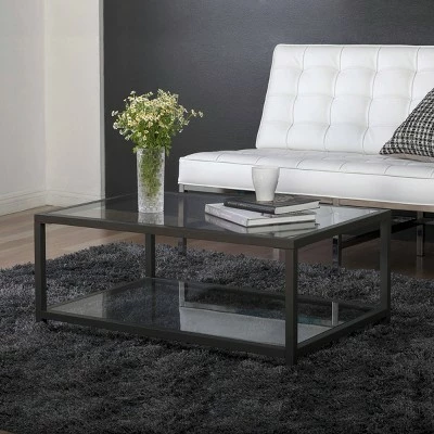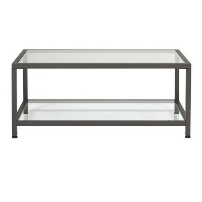 The Camber 36β Rectangle Coffee Table by Studio Designs Home offers a sleek, modern design that will complete your living room. This cocktail table offers a smaller footprint for apartments or smaller living rooms. It combines a stylish slate gray metal frame with tempered clear glass. The simple lines and neutral colors easily complement your homeβs decor. The tops provide plenty of space for everyday necessities. Floor Levelers are included for stability on any flooring surface. Look for our full line of Camber occasional tables to complete your living room and entryway. Overall Dimensions: 36β W x 23β D x 15.β H
