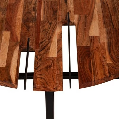 Eclectic style meets fine craftsmanship with this sophisticated Coffee Table from the Peter Collection. Featuring a round tabletop and replicated wood grain details, it is supported on knock down tubular legs with a uniquely designed X shape base. The aesthetically pleasing butcher block design imparts an astonishing flair to it. Handcrafted from the amalgam of acacia wood and steel frame for lasting durability, the dual tone finish in warm brown and striking black tone compliments the overall structure. The inbuilt metal flats make perfect stands to keep your magazines handy and organized. Enjoy your scrumptious snacks and beverages served on the table whilst lounging on your comfortable sofa set.