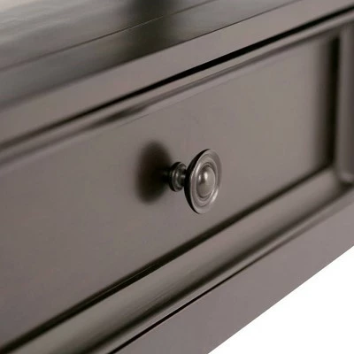 - Transitional style includes elegantly tapered legs, molded crown edged table top, panel framed drawer fronts, metal drawer glides and Antique Pewter round decorative knobs