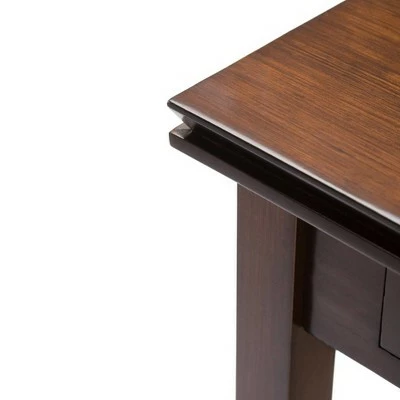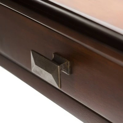 - Transitional design includes clean angle edged table top, square, slightly tapered legs and rectangular Antique Bronze knobs