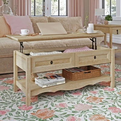 A lift-top coffee table completely transforms a living room. Transform yours with function and style with the lift-top coffee table from the Adaline Café™ collection. The top of this pop up coffee table lifts up and forward to create a versatile surface for working, snacking, or playing games with family. This wood lift-top coffee table includes hidden storage beneath the lift-top for remotes, magazines, books, and more. For an added touch of style and interesting design, this lift-top coffee table with storage includes faux drawer fronts and elegant curvature along the lower shelf. The open lower shelf of this wood top coffee table is ideal for organizing bins and other living room or den essentials. Finished in Orchard Oak™, this coffee table with lift-top is the multifunctional piece your home has been craving. We hope you like what you see. Sauder designers travel the world and bring back the best and latest in style, finish, and color trends. This inspiring world travel is evident in the cutting edge and innovative furniture solutions we offer to you!
