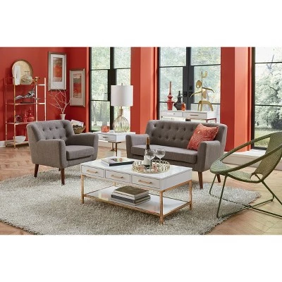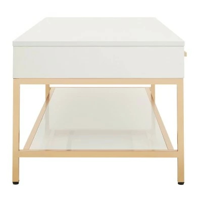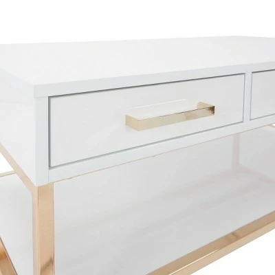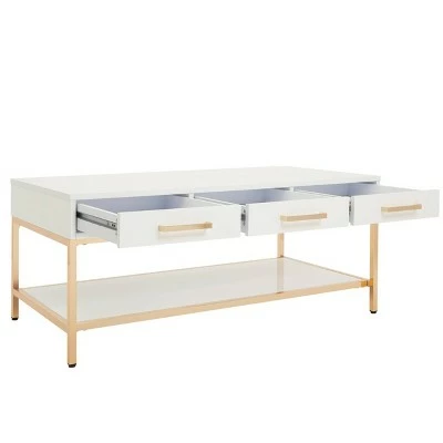Your chic living room awaits with a stylish cocktail table. A white gloss finish combines elegantly with gold plated chrome legs for a modern, sophisticated feel. Perfect for casual gatherings and sharing drinks. Three ample storage drawers allow plenty of room for your belongings. Get the contemporary home you’ve been craving with the Alios Cocktail Table.