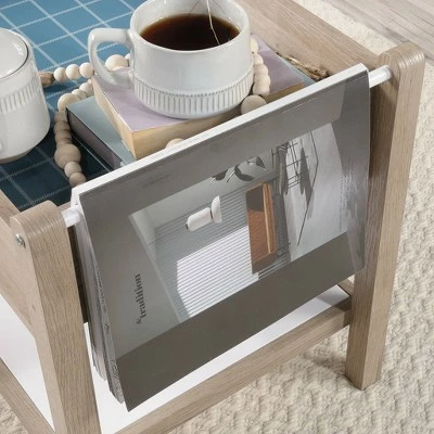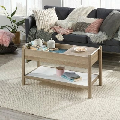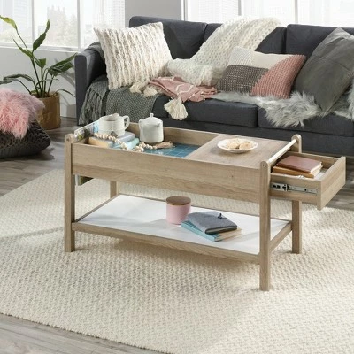 Is your living room missing something? How about a chic centerpiece that will catch the eye of all your guests. Create a beautiful aesthetic in your home when you add the modern style and simplistic design of this coffee table from the Anda Norr collection. This unique table features a multi-level top surface. On one side, it provides you with a spacious surface to store and display various items like decorative plants, coasters and of course your coffee mug. The other side features an inlaid shelf with screen-printed glass for an added touch of style, and makes a great spot for storing items like magazines and your reading glasses. This handy coffee table also features a hidden storage drawer on the side for miscellaneous items you prefer not be seen. If that’s not enough, you can also find additional storage space on the lower metal shelf. The rods on each end of the table can be used to hold magazines so you’ll never lose your page. It’s finished on all sides for versatile placement throughout any room in your home. Finished in Sky Oak with White accents, this stunning coffee table is everything your home needs and more.