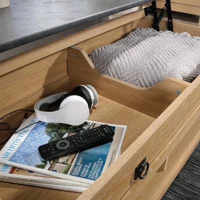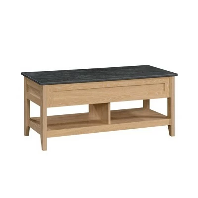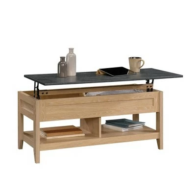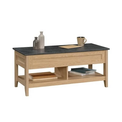 No living room is complete without the perfect coffee table. Add a touch of one-of-a-kind style and design to your home with this lift-top coffee table from the August Hill collection. This living room coffee table offers a spacious top surface that lifts up and forward to create a multifunctional work surface for you to work on your laptop, browse through social media, or enjoy a delicious dinner all while relaxing from the comfort of your own couch. Beneath the lift top is a hidden storage area that is perfect for stowing away items like spare blankets and board games. The lower open shelves provide you with you with additional space for storage and display of items like potted greenery, magazines, and organizing baskets. This living room coffee table is finished on all sides for versatile placement throughout your home. Finished in Dover Oak® with Slate accents, this attractive coffee table will make a great addition to your home.