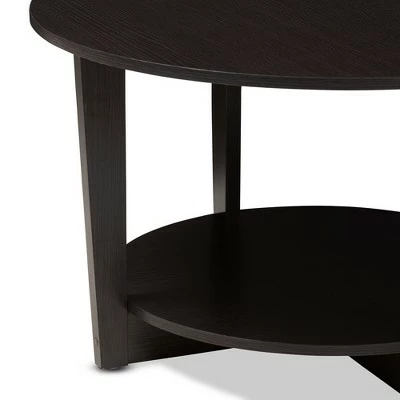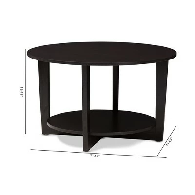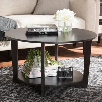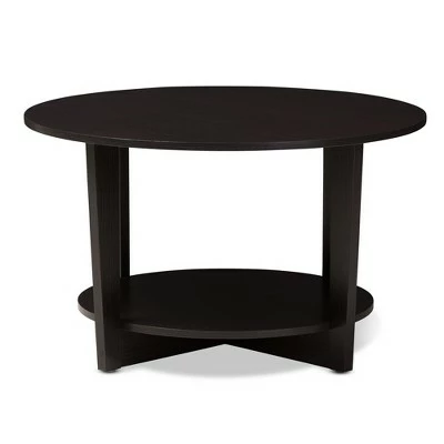 The Belina coffee table is the ideal way to bring the look of your livingroom together. The modern and contemporary-inspired design emphasizes clean lines and geometric shapes. The Belina is finished all over in a welcoming, wenge brown. The table features a smooth, circular table top, with a matching circular shelf underneath. The open space beneath the table top is ideal for storage or displaying decor, making the Belina a great option as an accent table. The legs of the table are slightly tapered and connect at the bottom in a symmetrical cross design. Made in Malaysia, the Belina requires assembly.