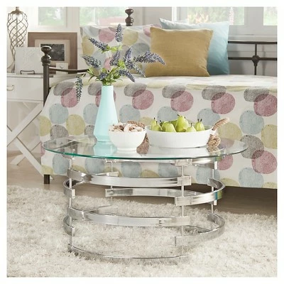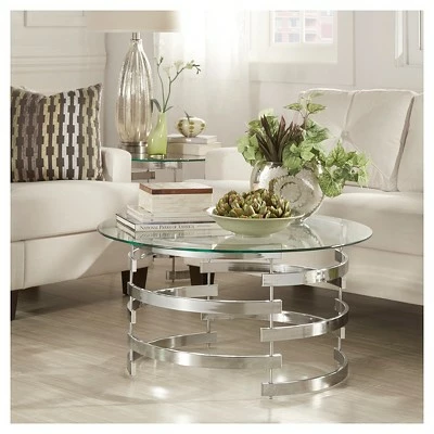 Modernize your living space with the Bianca Contemporary Open Cocktail Table Chrome by Inspire Q. This futuristic cocktail table is made with alternating strips of chrome plating around the legs for stunning visual appeal and support, and is topped with durable tempered glass. Open air between the plates, the thin barely-there legs and the gleaming glass tabletop all come together to create a sleek, shiny piece of furniture with an airy, minimalist feel.
