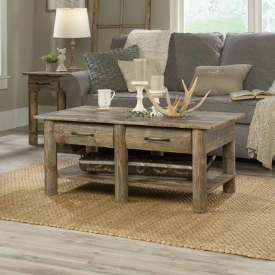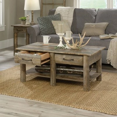 Bring your love of the outdoors right to the center of your living room with this coffee table from the Boone Mountain collection. This rustic coffee table offers a spacious top surface that provides you with room for items like magazines, decorative plants, coasters, and your hot cup of joe. Don’t worry, there’s plenty of room for you to kick your feet up too. This storage coffee table features two drawers that open and close on smooth metal runners for a convenient space to stow away things like the TV remote and your crossword puzzles. This coffee table with storage also feature two faux drawer fronts for an extra touch of detail. Need more, there’s additional storage and display space on the lower open shelf. This rustic wood coffee table features a sturdy, lodge wood construction. It’s also finished on all sides for versatile placement throughout your home. Finished in Rustic Cedar, this beautiful distressed coffee table is just what your home is missing.