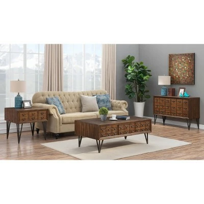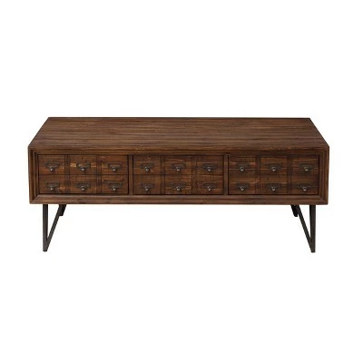 What a find! Our Cocktail Table finished in a rustic Oxford Distressed Brown could easily be mistaken for a vintage card catalog file. Antiqued “card holding” hardware makes double rows across the three drawer fronts, giving them the appearance of eighteen smaller compartments! Triangular dark metal legs hold our table aloft and reinforce the antique aura. Use alone or with the matching Console and Side Tables to set off your den or family room.