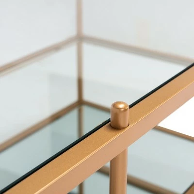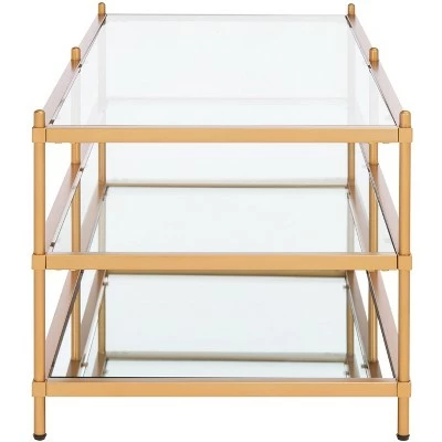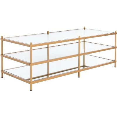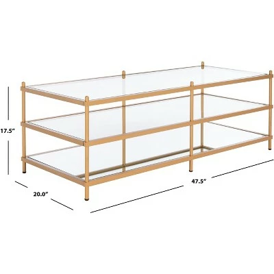 This Cathal Coffee Table is a designer must-have for todayÕs celebrity-chic dŽcor. Three tiers are ideal for storage or display, and glass and mirror shelves shine with glamorous depth thatÕs perfectly balanced by CathalÕs sleek gold frame. Care Instructions: Dust regularly with a soft, dry cloth. Never use oiled or treated cloths on lacquered finishes. Some finishes can be wiped with a damp (not wet) cloth, followed at once by rubbing with a dry cloth to remove fingerprints and smudges. For persistent spots, gently clean with a soft cloth and a solution of water and mild soap, make sure to wipe dry. Use adhesive felt pads, coasters and placemats to protect your furniture.