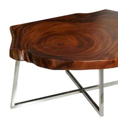 - This coffee table features a naturally shaped tree cut-out where you can see its historic rings as it stands on durable stainless steel