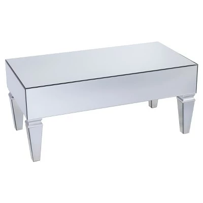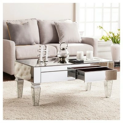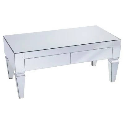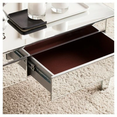 Store everyday essentials with the Aiden Lane Darla Contemporary Mirrored Rectangular Cocktail Table. Felt-lined drawers with sleek, mirrored fronts tuck away magazines and remotes, while the spacious tabletop holds your morning cup of coffee. Low-profile design slides neatly alongside your sofa or armchair, maximizing functional space in your living room. Enjoy relaxing evenings with family and friends when you add this mirrored coffee table to your home design.