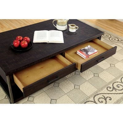 Stately with a rustic vibe, this industrial style coffee table from the Del collection makes a perfect addition to a casual home. With a dark oak finish and side support braces, this coffee table works nicely set in front of a sofa to keep photo books and a tray of refreshments and snacks nearby. Place this coffee table in a mountainside cabin’s living room or even the open air loft of a metro apartment.