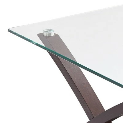 - Espresso brown finish over wood and MDF legs. Clear glass tabletop.