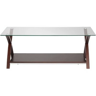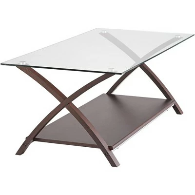Cool and sleek, this transitional coffee table is the perfect complement for an industrial or modern room. Finely crafted, the table’s espresso brown base is beautifully enhanced by a tempered glass top. This table also features a lower shelf for additional display space.