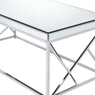 The Evelyn Cocktail Table offers modern elegance with its geometric base design and boxed mirrored top. You will enjoy how the light bounces off the table top and apron rail to create a larger more vibrant space. The mirrored table also features a sturdy iron base that is finished in gleaming chrome. Available for purchase separately is the matching end table. Your purchase includes one cocktail table.