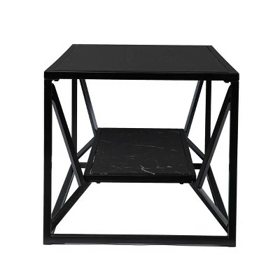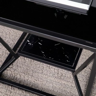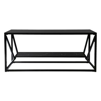 Double up on display storage with the Aiden Lane Finsfil Glass-Top Cocktail with Storage. A geometric design and monochromatic finish complement your modern décor, while the spacious tabletop keeps magazines and remotes in check. A faux marble display shelf houses décor pieces or spare blankets, making the most of your small space floorplan. Add a contemporary element to your living room design when you bring home this two-tier coffee table.