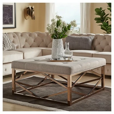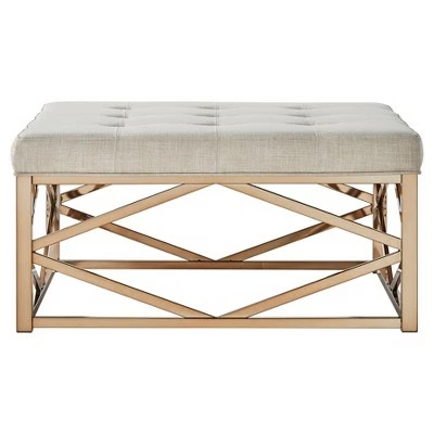 Add some contemporary style to your space with the Fontaine Champagne Dimple-Tufted Geometric Ottoman from Inspire Q. With a base design of bars creating diamonds and triangles, this tufted ottoman offers a luxurious spot to rest your feet after a long day. Place a tray in the center and fill with accent pieces or a stack of magazines for a final touch.