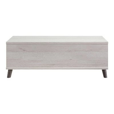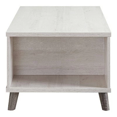 This 2-toned coffee table makes a stabilizes a living room with its powerful presence. The rustic white frame contains 2-side shelves, one central compartment, and a drawer on metal glides. This handy and level storage stands on flared and rounded feet for a trendy appearance to match the curved corners of the drawer.