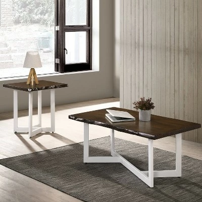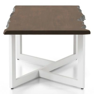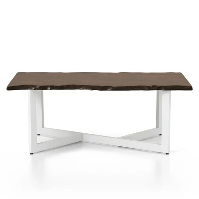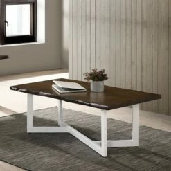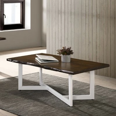Evoke a clean and classic aesthetic with this compelling transitional coffee table. A rectangular coffee table centers any sitting area with a generous live edge style tabletop in a rich dark oak wood finish. It’s anchored with a white finish metal base with a geometric angular design that draws the eye and adds a modern spin.