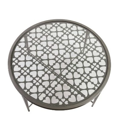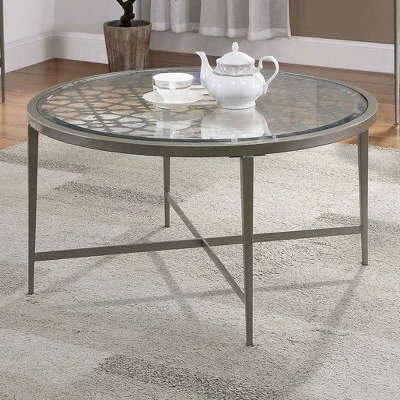 Elegant yet understated, this round coffee table from the Harding collection features a lovely silver finish. Perfectly suited for a contemporary style living room, this coffee table offers an airy tempered glass top with a beveled edge, supported by a cut-out mosaic decor pattern. Place this table in front of your sofa to set refreshments and snacks when family and friends gather around.