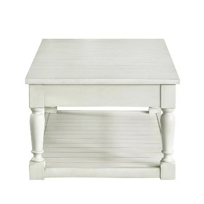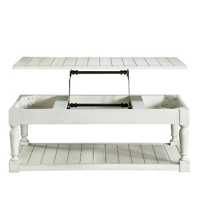 The Hemingway Lift-top Cocktail Table features classic cottage design with turned legs, planked top and a soft alabaster finish. The plinth base offers a sturdy foundation to anchor the Lift-Top convenience of the table. A bottom shelf offers additional storage or display options while two storage pockets underneath the lift-top offer convenient storage for remotes or other items. Also available in this collection (purchase separately) are the matching end table and sofa table. Your purchase includes one lift-top cocktail table.