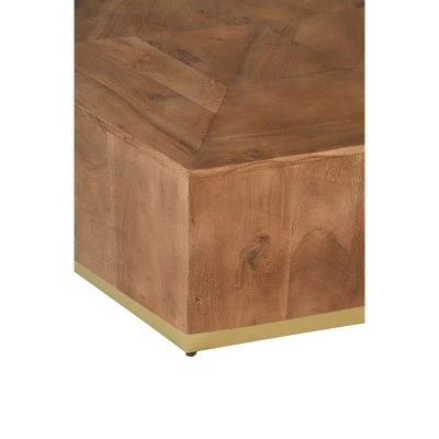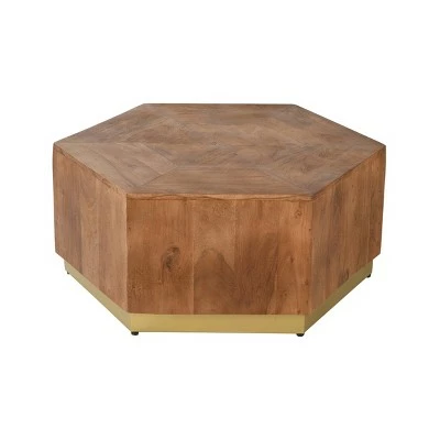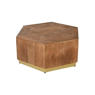 This unique Accent Coffee Table is made from Acacia wood in the hue of brown with knots and grain details that add raw appeal and depth to its look. Showcasing a hexagonal design, it comes with a spacious tabletop that is ideal for serving and display purpose. It incorporates a gold finish metal base complemented with metal feet that add to its style and durability for long-lasting use. This centerpiece coffee table is perfect for adding rustic and transitional elegance to your living space.