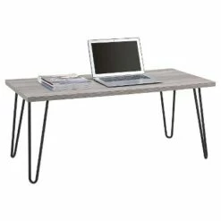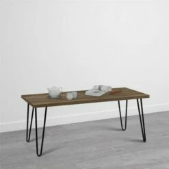 - Made from textured, laminated particleboard and powder-coated metal hairpin legs, the medium brown finish of the table top pairs well with both modern and transitional styles