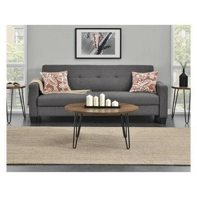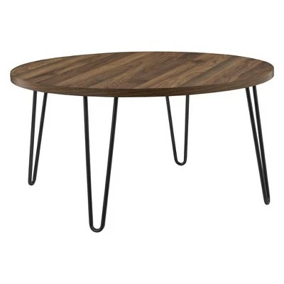 Add a fun retro look to your living room with the Room & Joy Heywood Retro Round Coffee Table. Crafted with a mid-century design, the black hairpin-style legs offer an industrial feel while the medium brown textured woodgrain finish of the round table top adds a classic touch that feels like real wood, allowing this piece to fit in with modern and transitional styles. The large table top offers plenty of space to place books, magazines, remotes and decorations. Made from laminated particleboard, the Table requires minimal assembly. Two adults are recommended for assembly. The Coffee Table can hold up to 60 lbs. Once assembled, the Coffee Table measures to be 17.83”H x 35.43”W x 35.43”D.