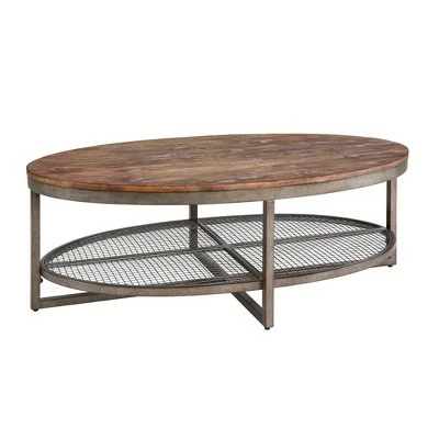 The Sheridan Oval Coffee Table is the perfect modern industrial update to any living room. Rub your hands over the solid pine top to feel the natural beauty of the wood, combined with a heavy metal frame, and accented with a lower wire mesh shelf for storage. Featured in a chestnut wood finish with a tarnished silver metal frame. Assembly required.