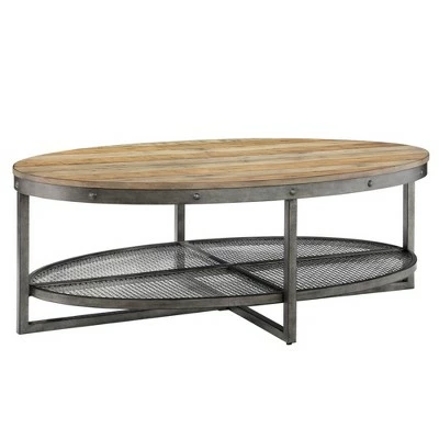 The Sheridan Oval Coffee Table provides a bold industrial update to your living room décor. A weathered natural wood finish adorns the top of this oval shaped coffee table, creating a rustic allure. The metal base showcases an antique silver finish that complements the table top, while the lower wire mesh shelf offers plenty of space for storage. Combining the natural beauty of the wood table top and a heavy metal frame, this oval coffee table adds the perfect modern touch to your home décor. Assembly is required.