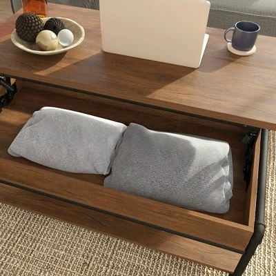 Is your living room décor beginning to look a little boring and bland? We can fix that! Update the style in your home when you add a touch of industrial-inspired design with the lift-top coffee table from the Iron City® collection. This unique living room coffee table features a spacious top surface that lifts up and towards you to create a multifunctional work space that allows you to work on your laptop or enjoy a yummy meal all from the comfort of your own couch. Beneath its lift top is a hidden storage area that is perfect for stowing away things like magazines and books. The lower open shelf provides you with additional storage space for items like organizing bins and spare blankets. Its strong and lightweight panel construction makes it easy to move and reposition throughout your home. Finished on all sides in Checked Oak® and detailed with a textured, powder coated metal pipe frame, this industrial style coffee table is just what your home is missing.