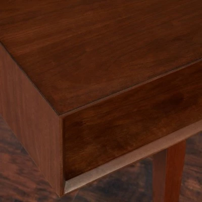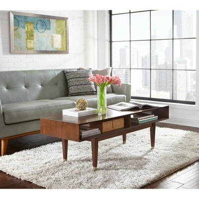 Transform the look of your living space with the Janice Cocktail Table by angelo:HOME. Mid-Century modern inspired design creates a functional table with open shelf storage with a middle divider for books, remotes, decorative items and more. Constructed of solid wood legs accented with gold-tone brackets and a veneered MDF top in a rich Walnut finish.