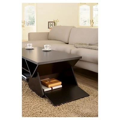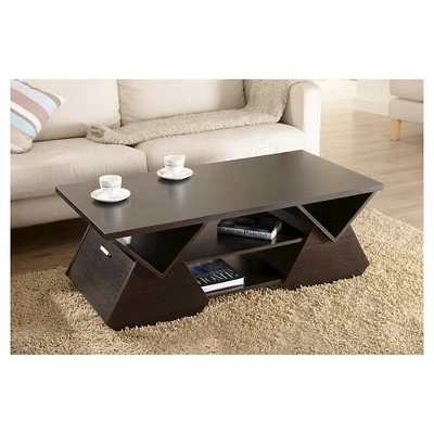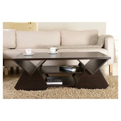 Visually stimulate your living room with the Katy Geometric Open Shelves Coffee Table. Optically enticing shapes blend to form a delectable, energizing look. Spacious and smooth, the tabletop rests on intricate shelves that form distinguished geometric shapes. Use the open shelves for housing decor or to quickly stow items from either side. The drop-down compartments provide additional storage space while the Espresso finish creates wonderful deep versatility. Update to distinctive Modern design that focus you living room.