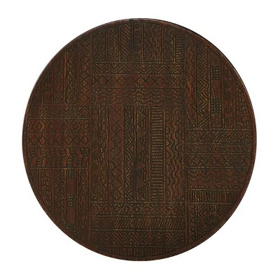 - This brown round coffee table has pattern carvings and stands on a solid black frame