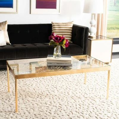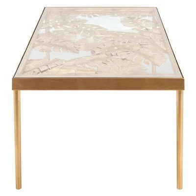 Created for those who appreciate fine artistic craftsmanship, this palm leaf coffee table Safavieh will be the focal point in any living room. The elegant glass top features a tropical palm leaf design enclosed all across it glass top design. Finished in an exquisite gold leaf finish, its glass top highlights its stunning design while keeping lines simple and elegant.