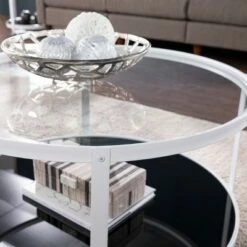 Take your contemporary style to the next level with the Aiden Lane Libing Glass-Top Cocktail Table. A round tabletop and open glass shelf hold everything from framed photos to afternoon drinks to potted plants, while the sleek metal frame keeps your design sleek and simple. Tuck this round cocktail table into your formal sitting room to receive dinner party guests, or place in your family room to serve up movie night snacks. Bring chic style to your home with this two-tone coffee table.