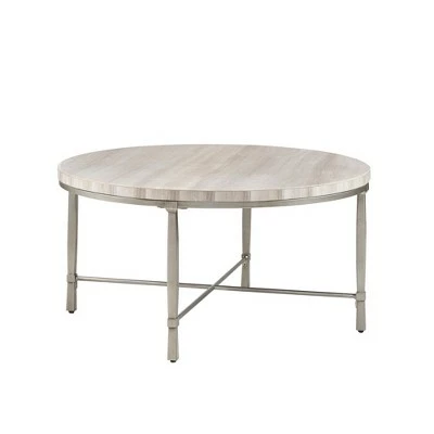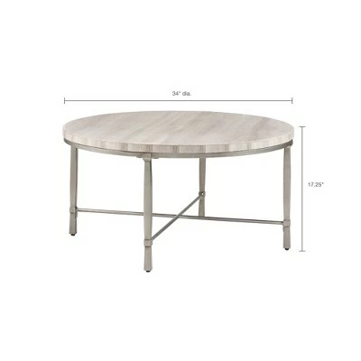 The Gretna Round Coffee Table provides a simple, yet beautiful addition to your living room décor. This round coffee table features a marble table top, in rich hues, for a chic transitional look. The sturdy metal legs and frame flaunt a silver painted finish to complement the marble top. Elegantly designed, this coffee table adds a sophisticate touch to update your home. Assembly is required.