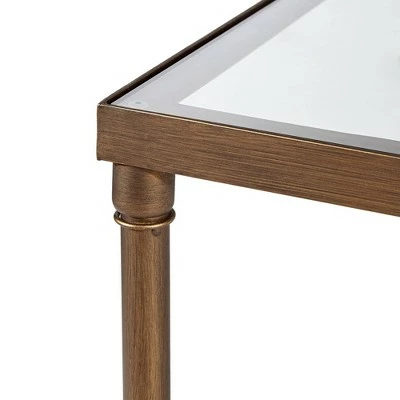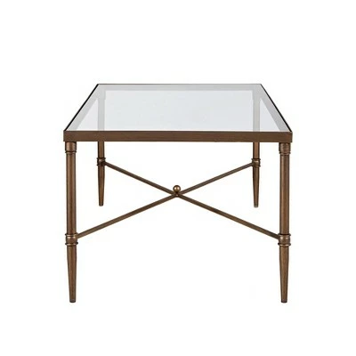 Complete your living room with the Porter Rectangle Coffee Table. This contemporary style table will add that eccentric modern look to your decor and become the center of attention of the room. The table features bronze finish metal frame with a lower cross support and finally topped off with a 5mm tempered glass tabletop. Assembly required.