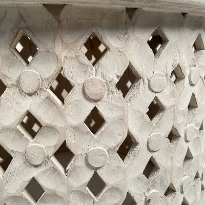 A perfect blend of style and sophistication, assimilating this Coffee Table will add a riveting flair to your existing decor setting. Incorporated with a wide round top to serve scrumptious snacks and beverages, the intricate diamond cut out design is accompanied with textured round accent. Constructed sturdily from the mango wood frame for lasting durability, the washed white finish complements its salvaged appeal. Though inspired by farmhouse style, this piece of furniture readily blends with any kind of interior. The reinforced round and stable base provides the Coffee Table with the required support and sturdiness. The unfinished edges and distressed detailing all over the frame, add character to your interior without compromising the integrity of your decor setting.