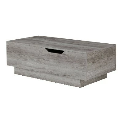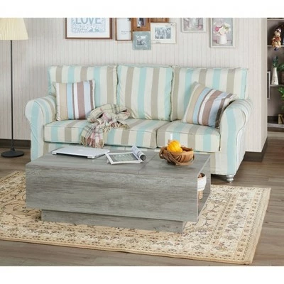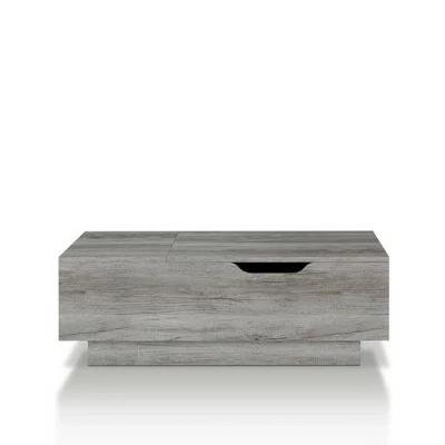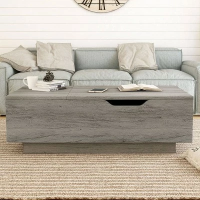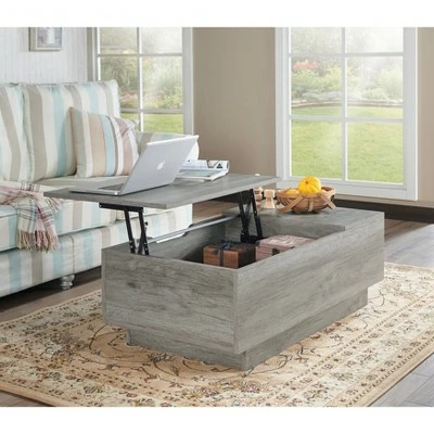 Ideal for compact living rooms, this rectangular coffee table offers a lift top design and a hidden interior compartment space for all your cozy throws, games, and magazines. The lift top mechanism smoothly extends toward a seating area to bring snacks and refreshments closer as you unwind with a movie or TV show. Featuring a lovely vintage gray oak finish that lends a country rustic vibe, this coffee table works nicely in a transitional style home.