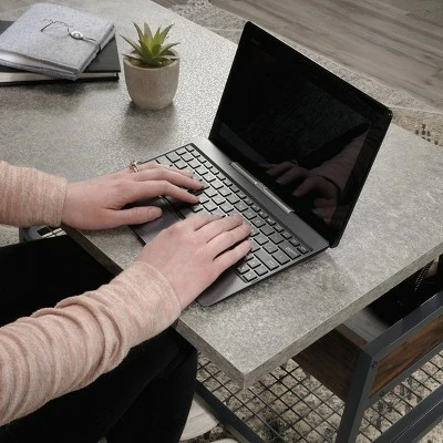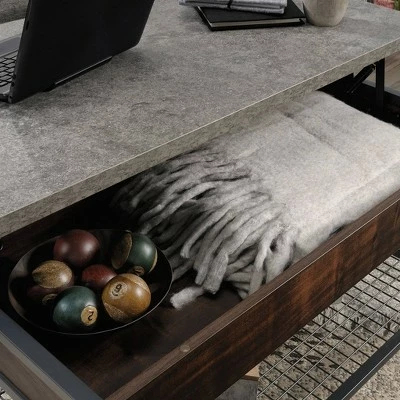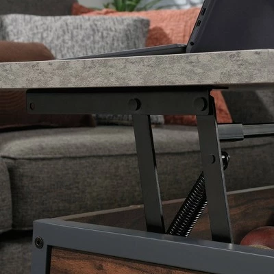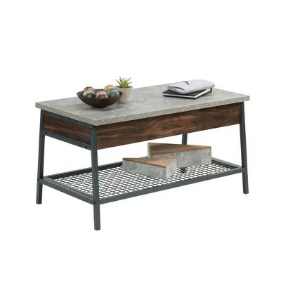 Never leave the couch again. Create the perfect solution for getting work done all while relaxing in front of the TV with this lift-top coffee table from the Market Commons collection. This coffee table with lift top features a spacious top surface that lifts up and towards you to create a multifunctional surface so you can work on your laptop, browse the web, or enjoy lunch or dinner from the comfort of your couch. The top surface features a strong and lightweight 1″ panel construction. Beneath the top is a hidden storage area that is perfect for storing items like blankets and your collection of novels. The lower wire mesh shelf provides you with additional storage space for items like board games and organizing bins. Attractive from every angle, this coffee table with storage is finished on all sides so it has the versatility to be placed just about anywhere in your home. Finished in Rich Walnut with Slate Gray accents and a black powder coated metal frame, this good looking metal and wood coffee table will be your new favorite part of the living room.