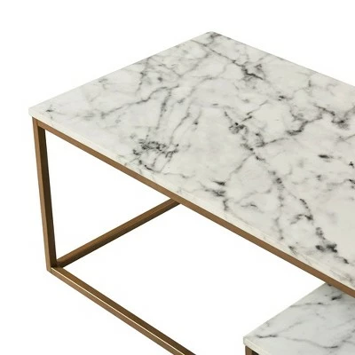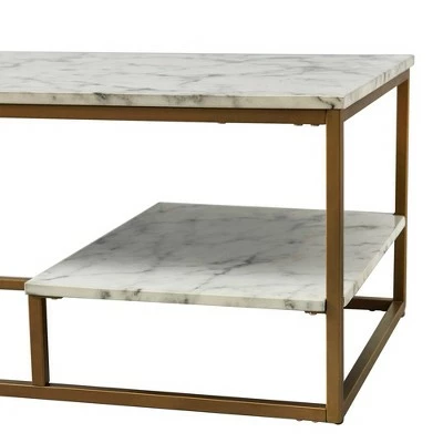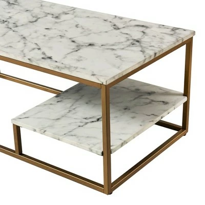 - STYLE: This classic Coffee Table is a luxury addition to any house, apartment, foyer, hotel lobby or your entertainment room. Brass finish metal legs, the faux marble table top blends well with both modern and transitional styles. A hollow frame design provides a display and storage space under which is a space saver to your home.