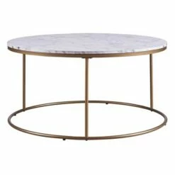 Add a modern accent to your living space with the Teamson Home Marmo Modern Marble-Look Round Coffee Table. This Greek-inspired coffee table features a round design complete with a gold-brushed base and a glossy faux-marble top for an elegant addition to any space in your home. Constructed from durable materials, this side table is stain and scratch resistant with easy-to-clean surfaces that make wiping up every day spills a breeze. Purchase this marble-look table on its own or with other items from our Marmo collection to add a matching furniture set and a more cohesive look to your home. For quick and easy assembly, this accent piece only requires a screwdriver to put together and includes step-by-step instructions. The Teamson Home Marmo Modern Marble-Look Round Coffee Table measures 36″ x 36″ x 18″ to provide organization and a timeless accent to any room while leaving ample space for other furniture.