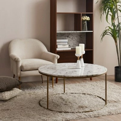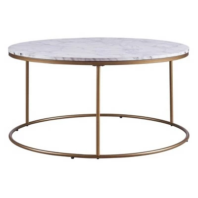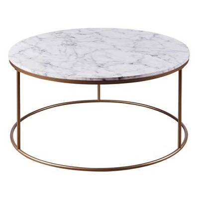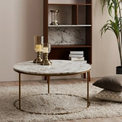 - STYLE: This classic coffee table is a luxury addition to any house, apartment, foyer, hotel lobby or your entertainment room. Brass finish metal legs, the faux marble table top blends well with both modern and transitional styles. A hollow frame design provides a display and storage space under which is a space saver to your home.