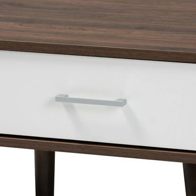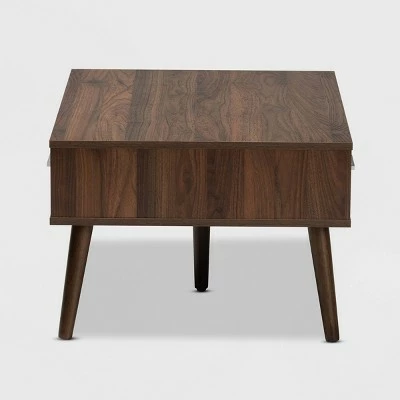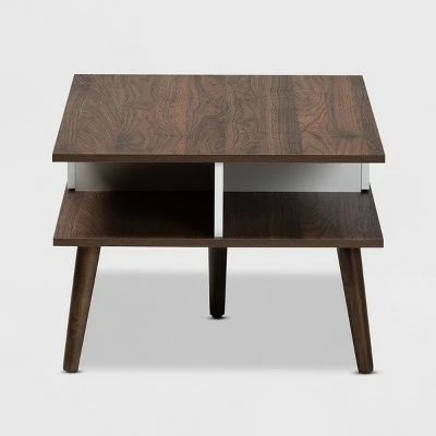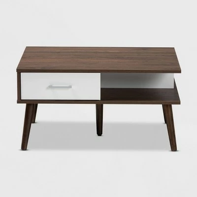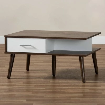 Form meets function in the Merlin coffee table. Drawers on either side provide storage for remotes, manuals, and more. Open shelves provide display space for your favorite books and magazines. Its two-tone walnut and white finish lends a cool retro look, while angled legs create a chic profile. The Merlin coffee table is made in Malaysia and requires assembly. Dimensions: 16.54″ high x 31.5″ wide x 23.62″ deep; Drawer dimensions: 15.23″ high x 12.8″ wide x 9.35″ deep; Shelf: 6.77″ high x 15.45″ wide x 11.5″ deep; Legs: 9.76″ high;