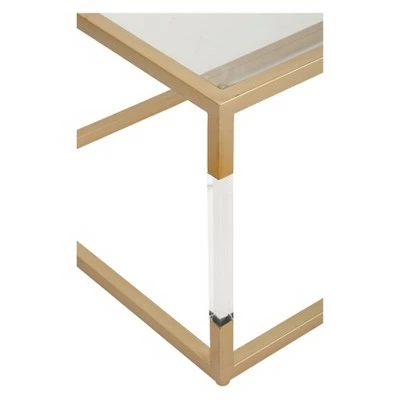 - Metallic gold finish over the metal frame, clear acrylic mid-sections alternating with gold sections along the legs and transparent glass top
