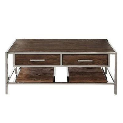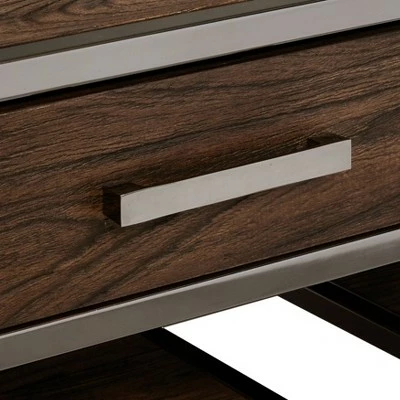 Compelling angles, smoked metal trim, and rich coffee-brown ash veneers come together to make this refined accent piece a design masterpiece. Two drawer glide out on full-extension guides for easy storage, and two large slab-style shelves below are ideal for stashing board games, books, and magazines. Modern and industrial influences make the box-in-box style an ideal fit for a stylish, elegant living room or den.