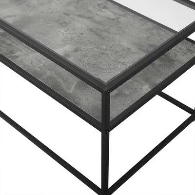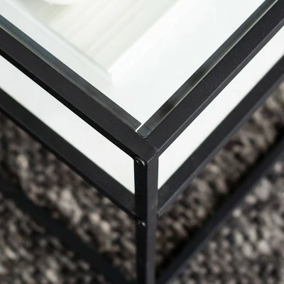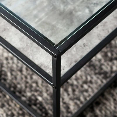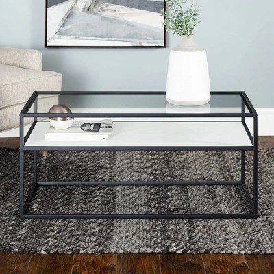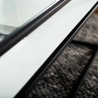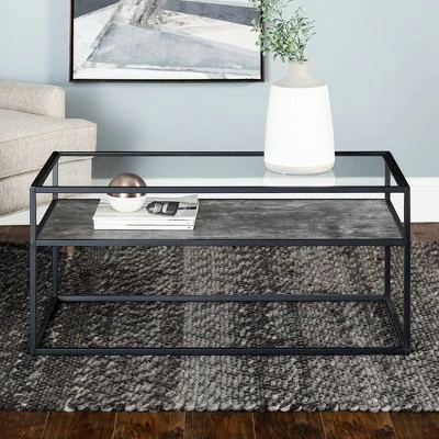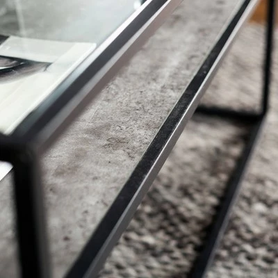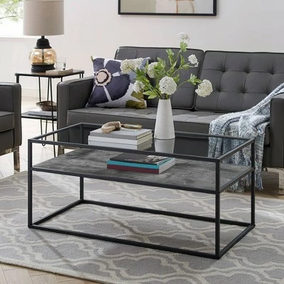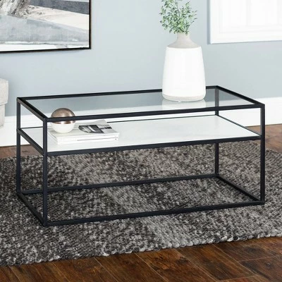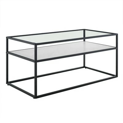 Reflect your unique style sensibilities with this coffee table with prism metal from Saracina Home. It features a clear tempered glass table top where you can easily set out drinks, hors d’oeuvres, or the bag of greasy potato chips you keep for when no one else is around. Don’t worry, we won’t judge. This mixed material coffee table also includes a reversible lower shelf so, whether your tastes, decor or simply your mood changes you can switch what finish is on display with this modern cocktail table.