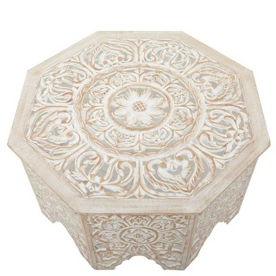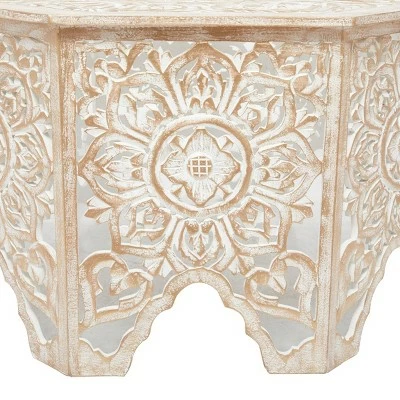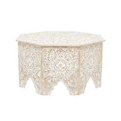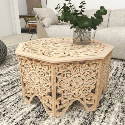 Throw in a vase or a lovely sculpture at the center of this coffee table to complement its intricate and bold carvings for a majestic furniture piece inside your home . A spacious table top with a unique design offers an eye catching display from every angle. Sit back, relax, but don’t put your feet up on this coffee table. This item comes shipped in one carton. Due to the handmade nature of this item, no two will be alike, there will be slight differences in shape, size, and color. Suitable for indoor use only. Made in India. Country cottage design. Maximum weight limit is 100 lbs.