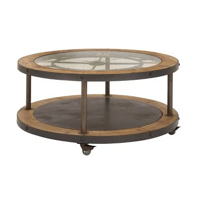 - This industrial coffee table is crafted with MDF, metal, and glass material